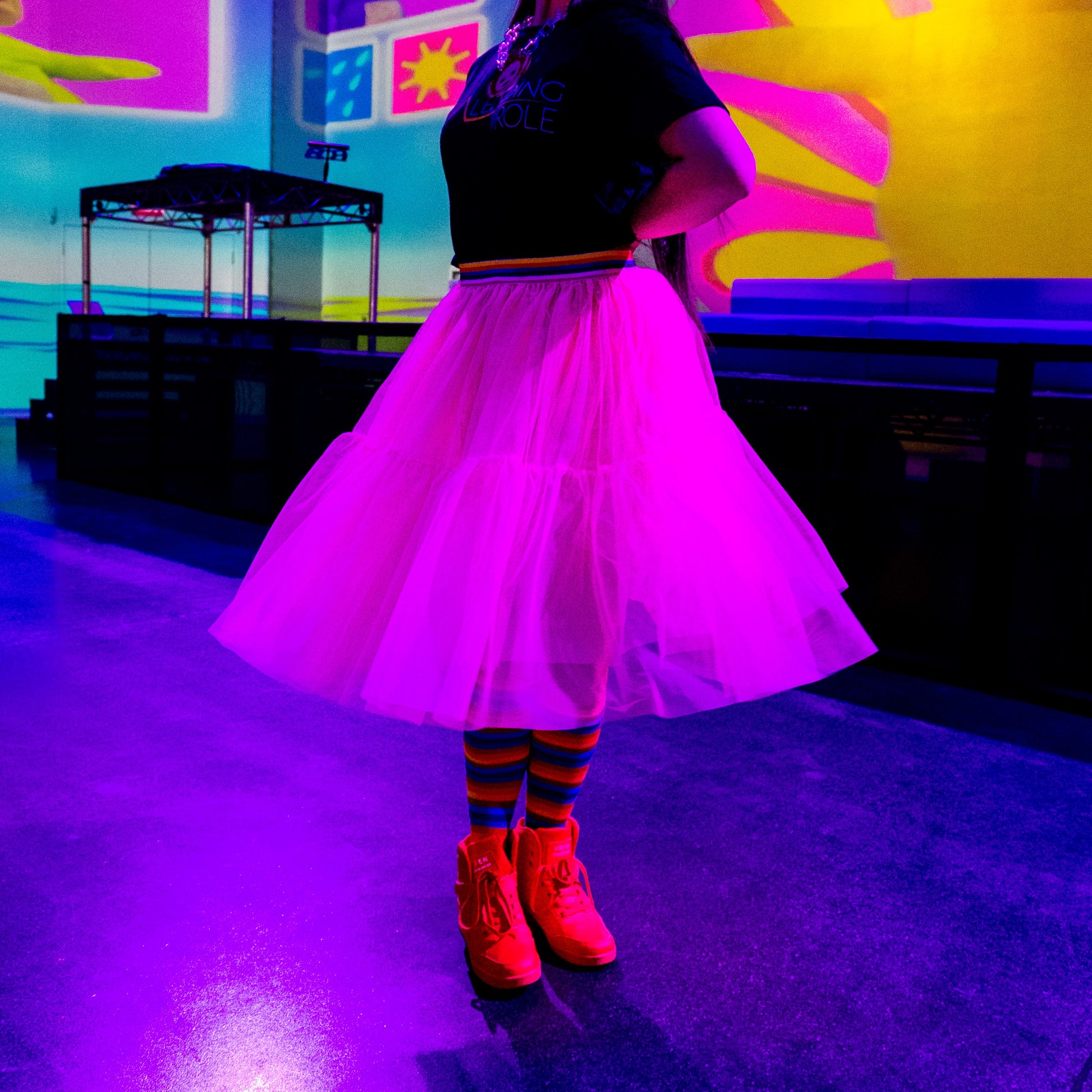 Light up the room (literally) with our A Leading Role Child Long Pink Glow Skirt! This sheer tulle skirt features a rainbow waistband and glows under UV black light for an extra touch of fun. Perfect for parties, dress-up, or just adding a pop of color to any outfit. Keepsake quality. Made in the USA.