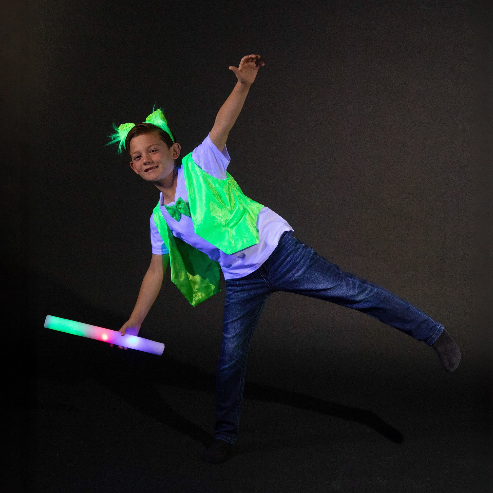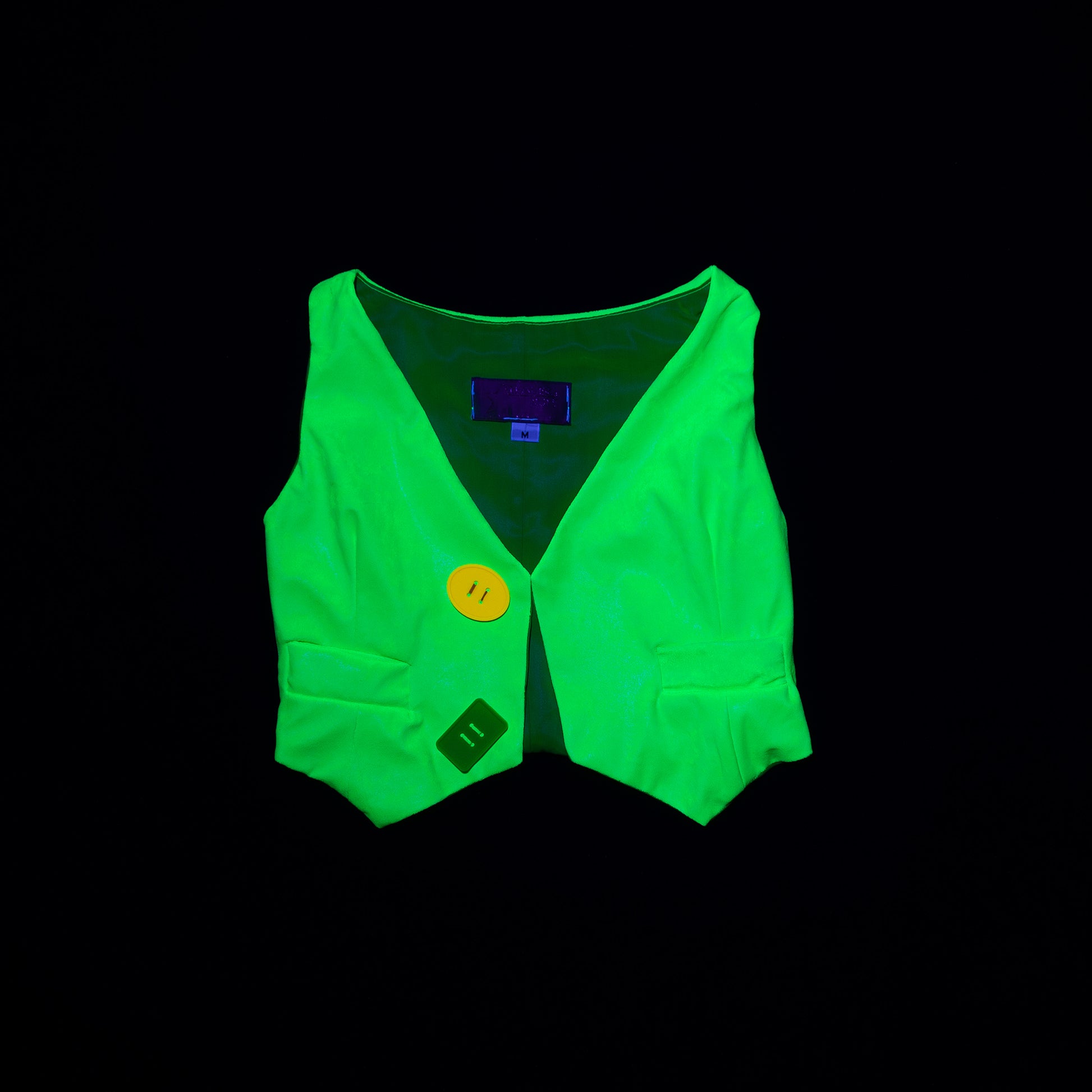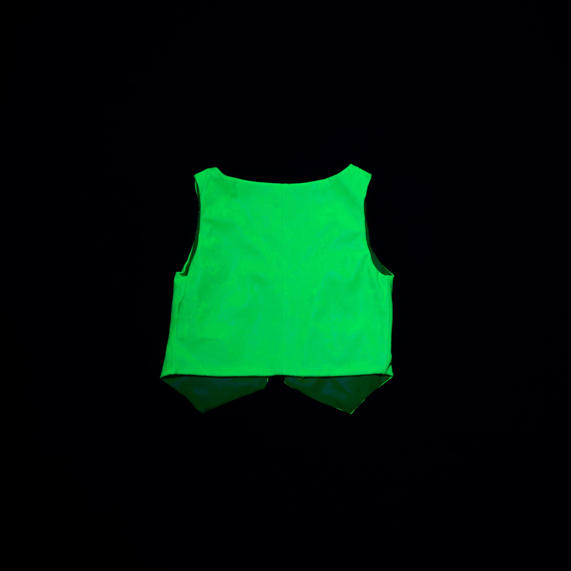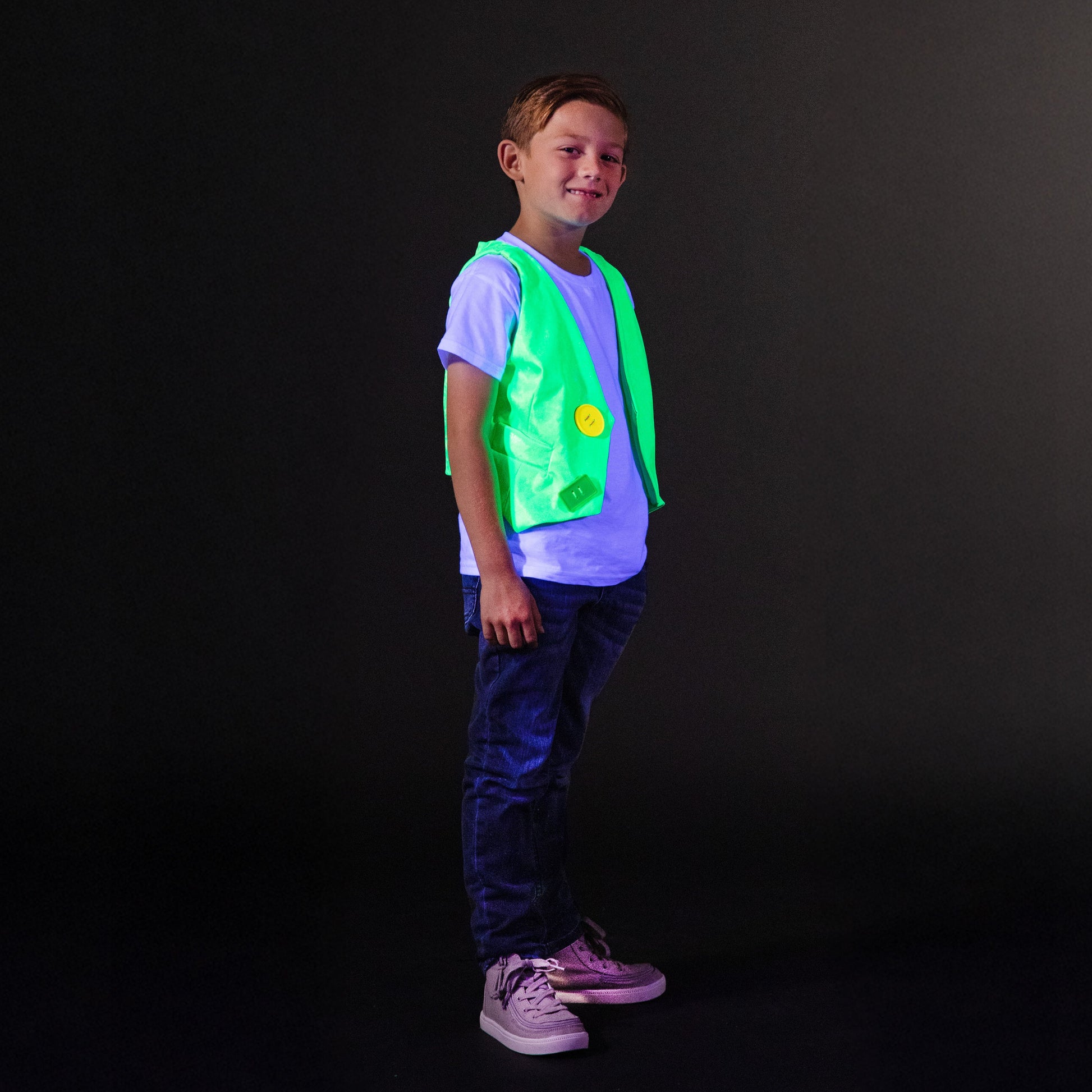 Get ready to shine bright with our A Leading Role Green Glow Vest—the ultimate outfit upgrade for young adventurers! Whether it's playtime, costume fun, or a fashion-forward mission, this vest transforms under UV light for a jaw-dropping glow effect. Fun-shaped button trim adds a playful look.
